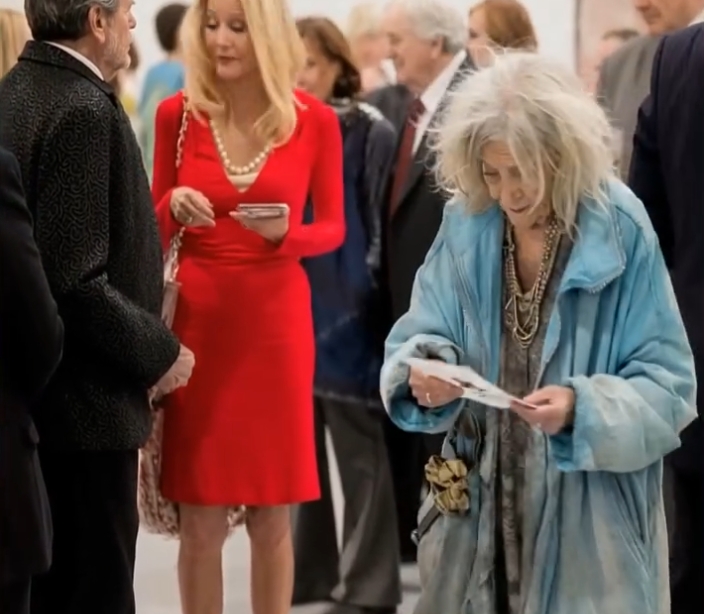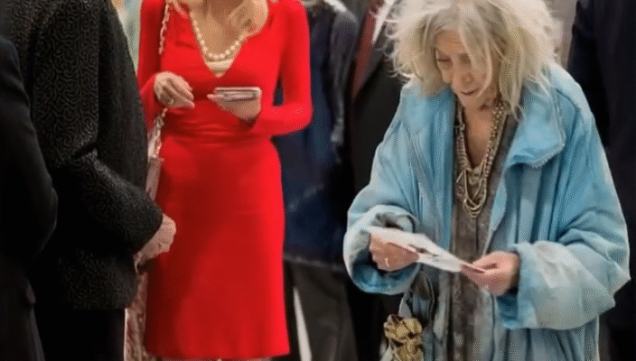 I own a small, classy art gallery in downtown Seattle—polished oak floors, soft jazz, warm light on gold-framed paintings. People sip wine slowly, nod, whisper, pretending their murmurs carry wisdom. Then, one rainy Thursday, everything changed. I was straightening prints when I saw HER: an older homeless woman, late ’60s, gray matted hair, hunched over a threadbare coat, shaking under the awning. Lost. Cold. Desperate. Before I could reach the door, the usual patrons arrived—the pearls, the suits, the invisible crowns. Their reactions were immediate: “OH MY GOD, THE SMELL!” “SHE’S DRIPPING WATER ALL OVER MY SHOES!” “GET HER OUT!” “WHY WOULD ANYONE LET HER IN?!” Her shoulders stiffened. She flinched at every sneer. Kelly, my assistant, whispered, “Do you want me to—” “No,” I said firmly. “Let her stay.” The older lady stepped inside, water dripping onto the polished floor, coat hanging limply. Visitors turned their backs, whispered, smirked. One muttered, “SHE PROBABLY CAN’T SPELL ‘GALLERY’.” I clenched my hands but stayed calm. She walked slowly, eyes tracing each painting. Then she stopped. In front of a sunrise city skyline, orange and violet bleeding together, her eyes widened, lips trembling. “That’s… mine,” she whispered. “I painted that.” The room WENT SILENT. Then came the first laugh: harsh, condescending. “SURE! MAYBE YOU PAINTED THE MONA LISA TOO.” Whispers followed: “HASN’T EVEN SHOWERED THIS WEEK. LOOK AT THAT COAT!” She didn’t flinch. She pointed to the corner of the painting. Beneath the varnish: M. L. “WHAT?!” I gasped. My heart sank. She wasn’t lying. Little did I know WHO was standing before me